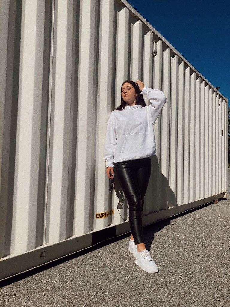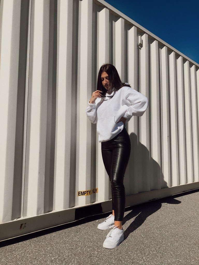 Below is one of my favourite ways to style a basic white hoodie: with faux leather leggings I purchased for the fall season along with a pair of platform white sneakers.